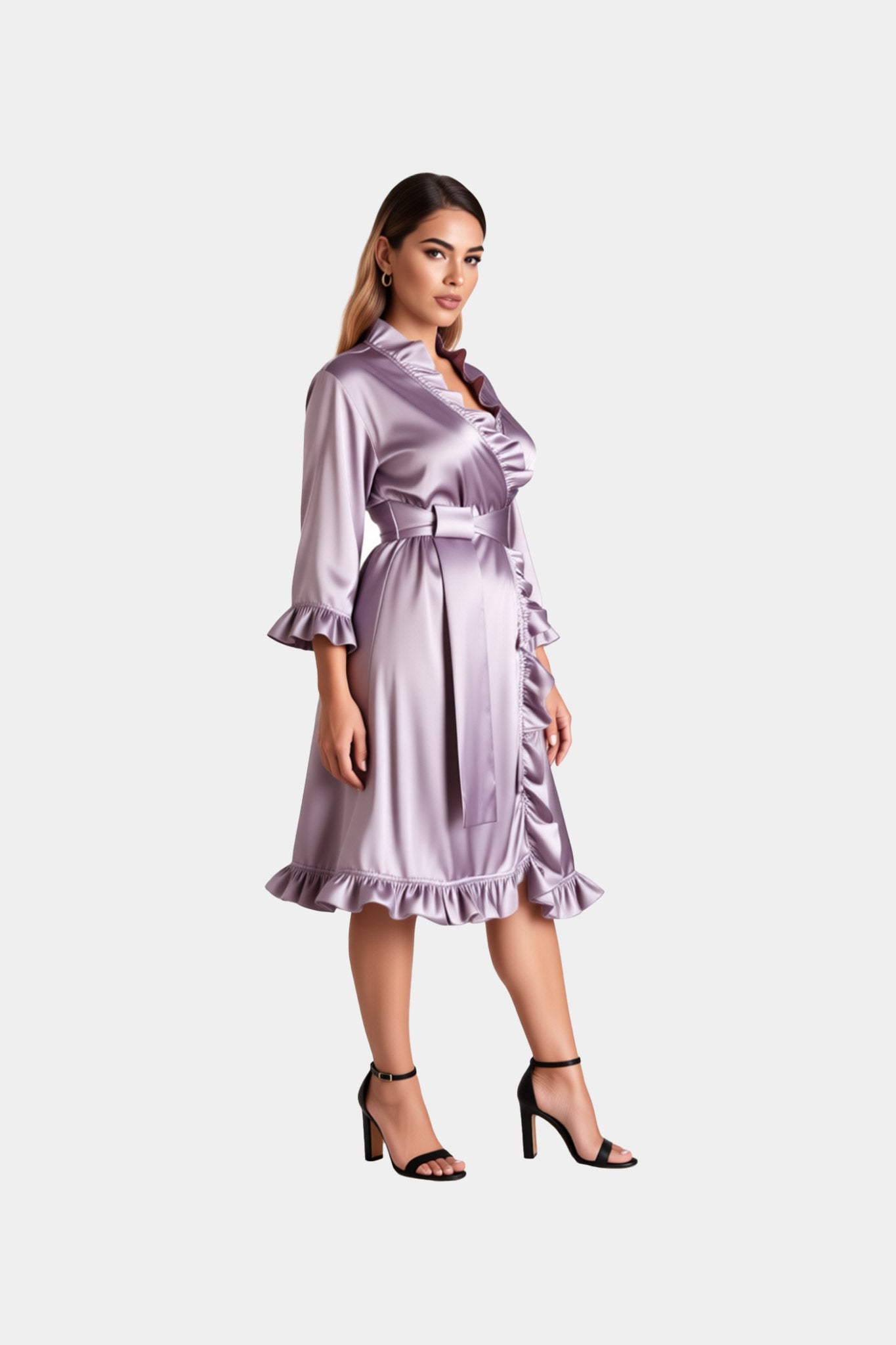 Luxury Satin Robe — where elegance meets comfort. Crafted from premium satin, it glides effortlessly over the skin, leaving a silky, delicate touch. The graceful ¾ sleeves with refined ruffle details add a hint of romance, while the waist tie beautifully highlights your natural curves.