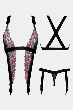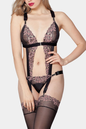 Sexy corselette made from shiny black mirofiber and delicate floral lace. Corselette consists out of two parts - the corselette itself and thong panties. Design includes elasti soft straps adjustable in size for perfect fit. Closure between the cups from the front for extra comfort