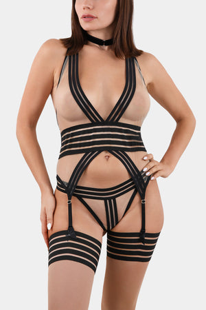 Corset made of soft, transparent mesh. Adjustable hosiery holders. At the waist, an elastic waistband that highlights the waist.
