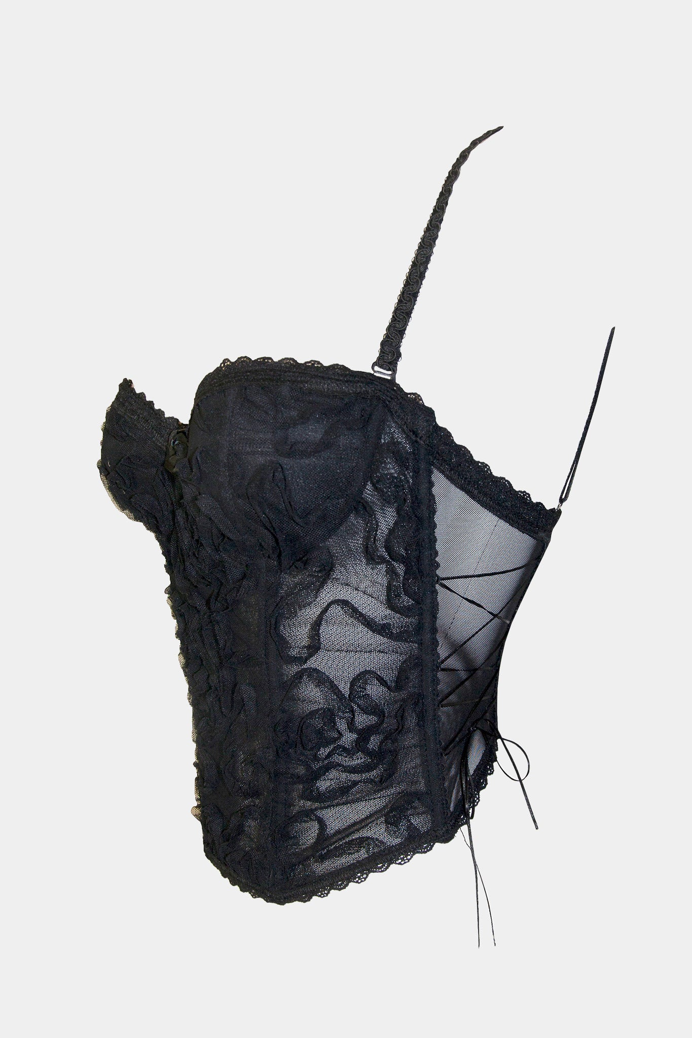 Elegant corset with a push-up effect, crafted from voluminous mesh lace that delicately shapes the silhouette. The design features an original adjustable back with smooth satin lacing, allowing for a personalized and comfortable fit. Thin decorative side ribbons provide additional volume adjustment, enhancing both comfort and flexibility. The corset is finished with removable, smooth satin shoulder straps with adjustable length, as well as a matching satin back strap with regulation for refined support. Removable corrective pads gently enhance the décolleté, creating a beautifully balanced and feminine shape.