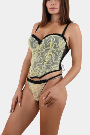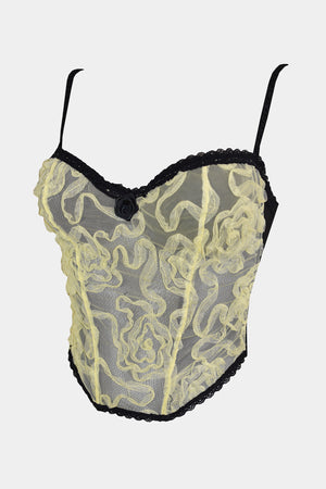 Elegant corset with a push-up effect, crafted from voluminous mesh lace that delicately shapes the silhouette. The design features an original adjustable back with smooth satin lacing, allowing for a personalized and comfortable fit. Thin decorative side ribbons provide additional volume adjustment, enhancing both comfort and flexibility. The corset is finished with removable, smooth satin shoulder straps with adjustable length, as well as a matching satin back strap with regulation for refined support. Removable corrective pads gently enhance the décolleté, creating a beautifully balanced and feminine shape.