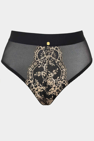 High-waisted classic-fit panties crafted from soft elastic mesh and luxurious floral lace. The elevated waistline enhances the silhouette while providing comfortable support and a flattering shape.