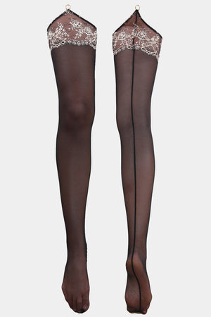 Stockings designed for a garter belt, crafted from highly durable silky mesh and exquisite Italian lace with a delicate floral motif. The elegant vertical back seam visually elongates the silhouette, adding a timeless, sophisticated touch.