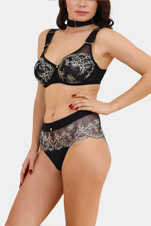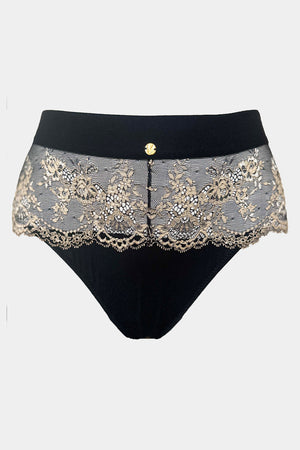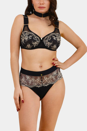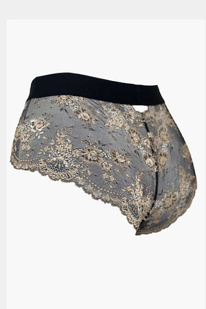 Elegant Brazilian panties crafted from soft mesh and Italian lace with a delicate floral motif. The carefully designed cut ensures exceptional comfort and an invisible fit under clothing. A miniature gold pendant adorns the center, adding a touch of sophistication. The gusset is lined with 100% cotton for extra comfort and breathability. The scalloped lace edges create a refined, feminine look, making these panties both stylish and practical for everyday wear.