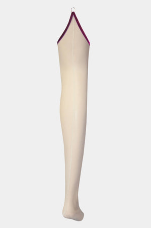 Jacqueline Run-resistant stockings made out of special sheer net and velvet tape top. Metal loops for stocking holders. Seam on the back.