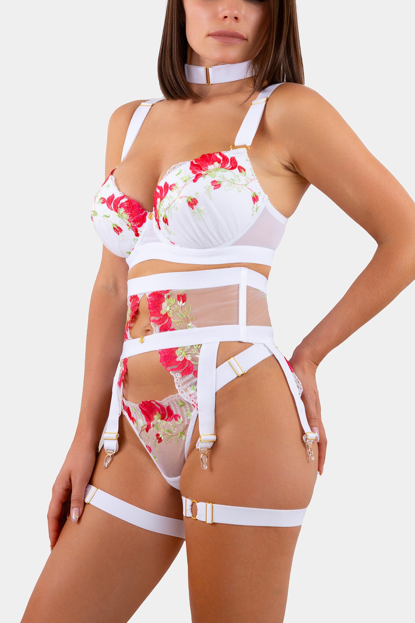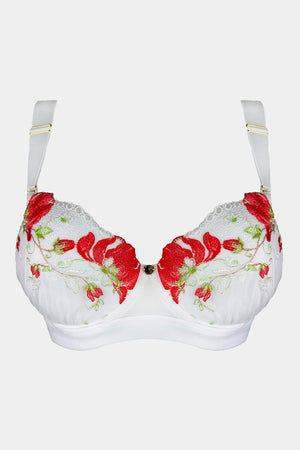 Push-up bra with moulded cups, made from embroidered lace with a bright floral motif. Inside the cups, there is a pocket made of elastic fabric with removable pads. The unique style and comfort are enhanced by wide (2.5 cm) elastic straps with gold accessories. The bottom is also finished with a wide elastic band, providing a firmer yet gentle fit to the body for better support. The back closure has three levels.