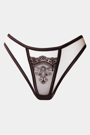Hipster panty made out of delicate lace and soft satin. Mesh from the front. Cotton gusset