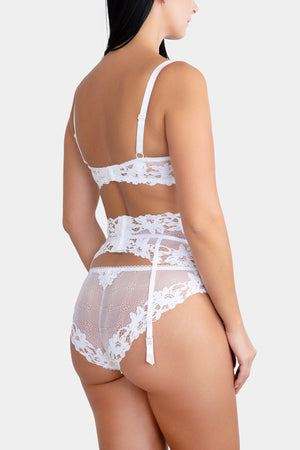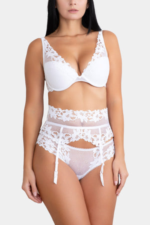 Bralette push-up bra with removable foam pads. The bra made out from Italian stretched lace with floral motive and decoreted of miniature satin roses on the center. Cotton to the body. Adjustable shoulder straps from 1.5 cm wide for more comfortable fitting.