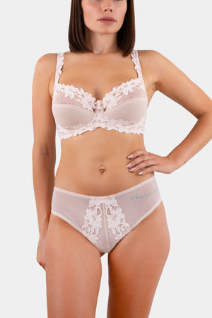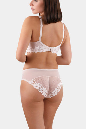 Underwired semi foam bra made out from Italian stretched lace with floral motive and decorated of miniature satin roses on the center. The lace back lining of modular mesh for perfeсt fitting and great support. Adjustable shoulder straps from 1.5 cm wide for more comfort.