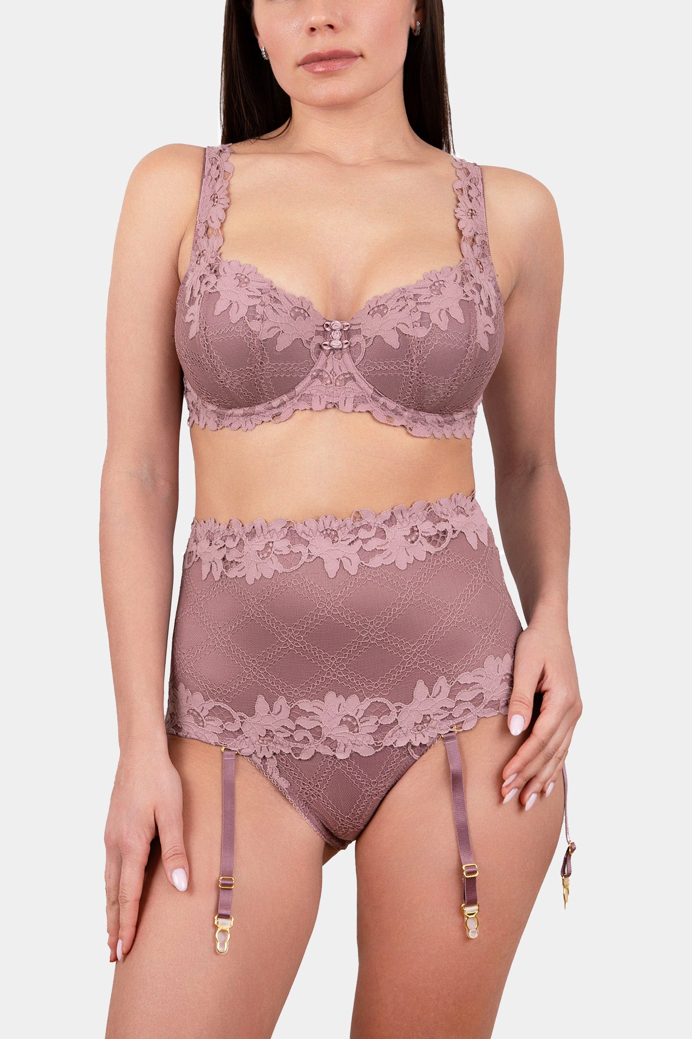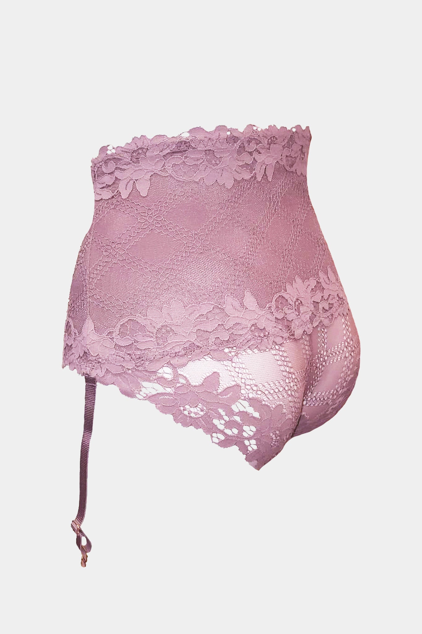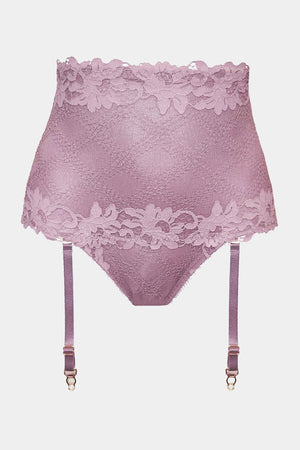 High-waisted panty made out from Italian stretched lace with floral motive. The panty have very comfortable fitting and invisible under clothing. The top of the panty is lining of modular mesh for maximum support and comfort. The holders for stockings are removable.