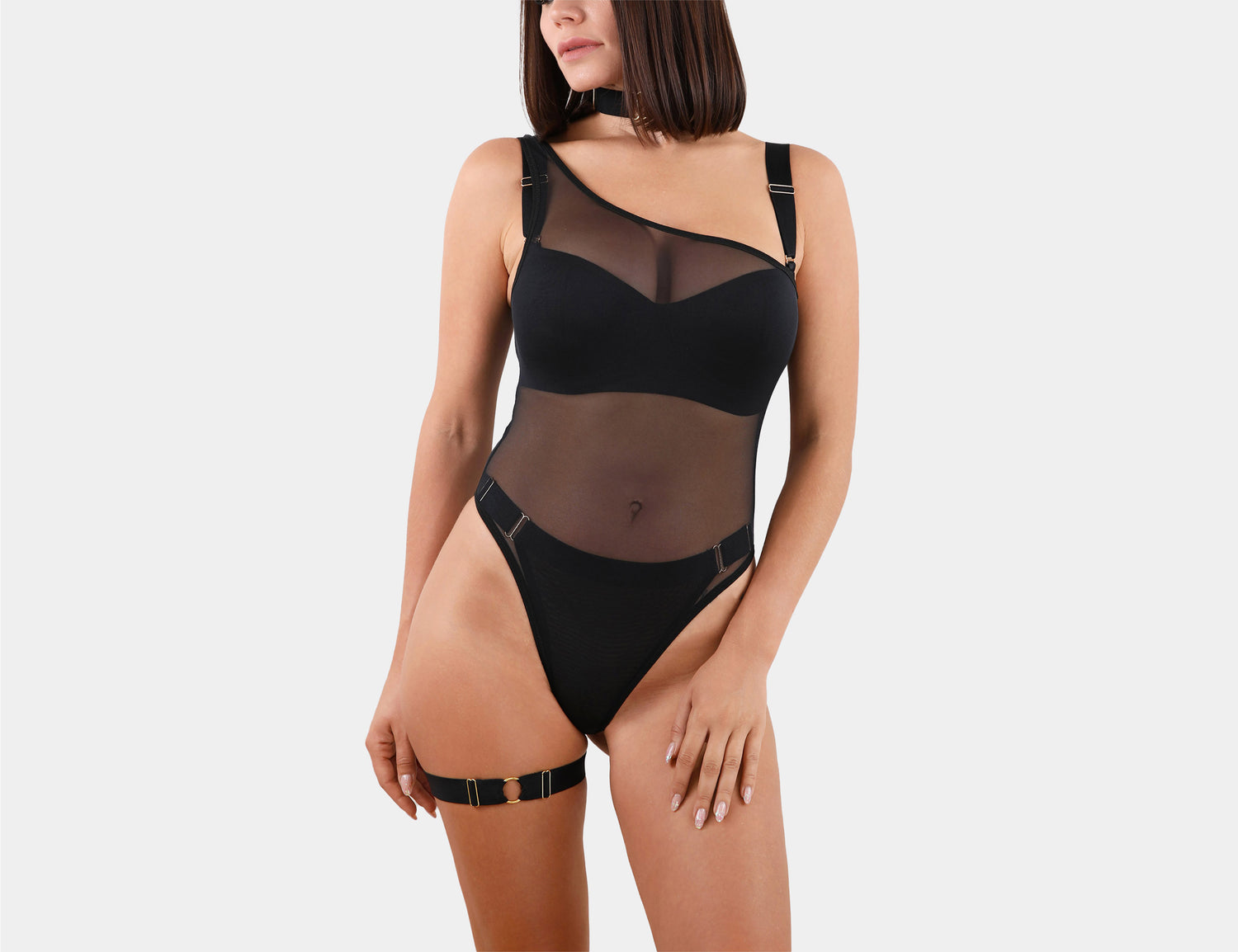 Tiffany Fashion Softcups-Bodysuit mit Bügel aus hellbraunem, seidig anmutendem Stretch-Netzstoff und elastischem Band mit Glanzeffekt. Verstellbare Schultergurte mit goldenen Verzierungen für mehr Komfort. Der originelle Rücken mit verstellbarem Band an den Verschlüssen für eine stilvollere Passform und mehr Komfort.
