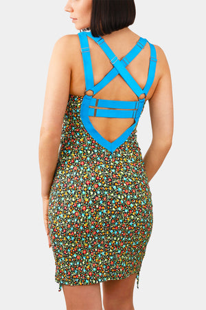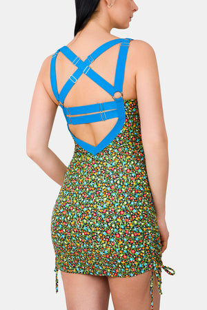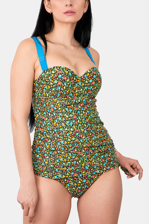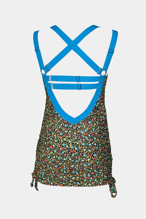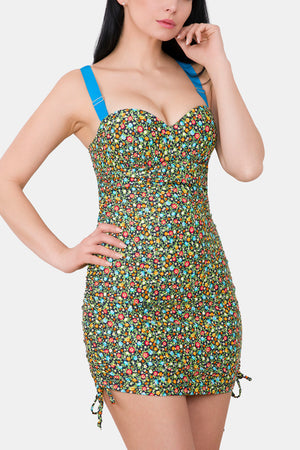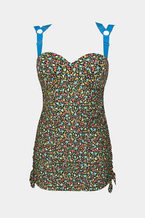 Balconette peldkleita ar ziedu apdruku un maigām platām gumijām. Visas siksnas ir regulējamas. Sānos ir saites, kas regulē kleitas garumu. Pielāgojiet garumu savam noskaņojumam — no stilīga T-krekla līdz iespaidīgai mini kleitai!