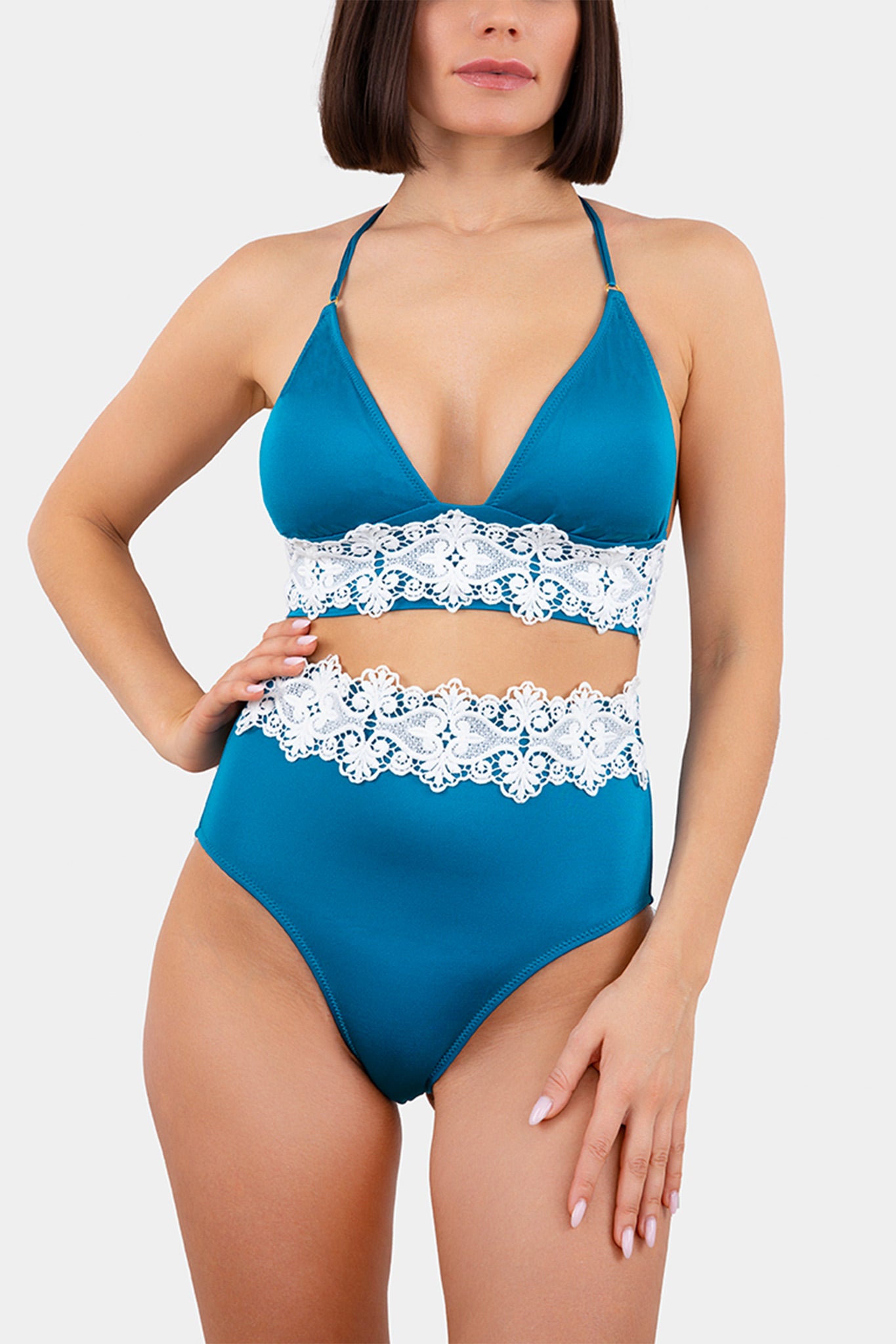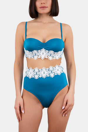 High-waisted bathing panties made of special microfiber. The panties are decorated with delicate lace.