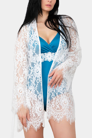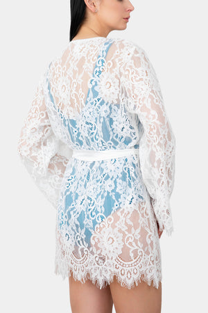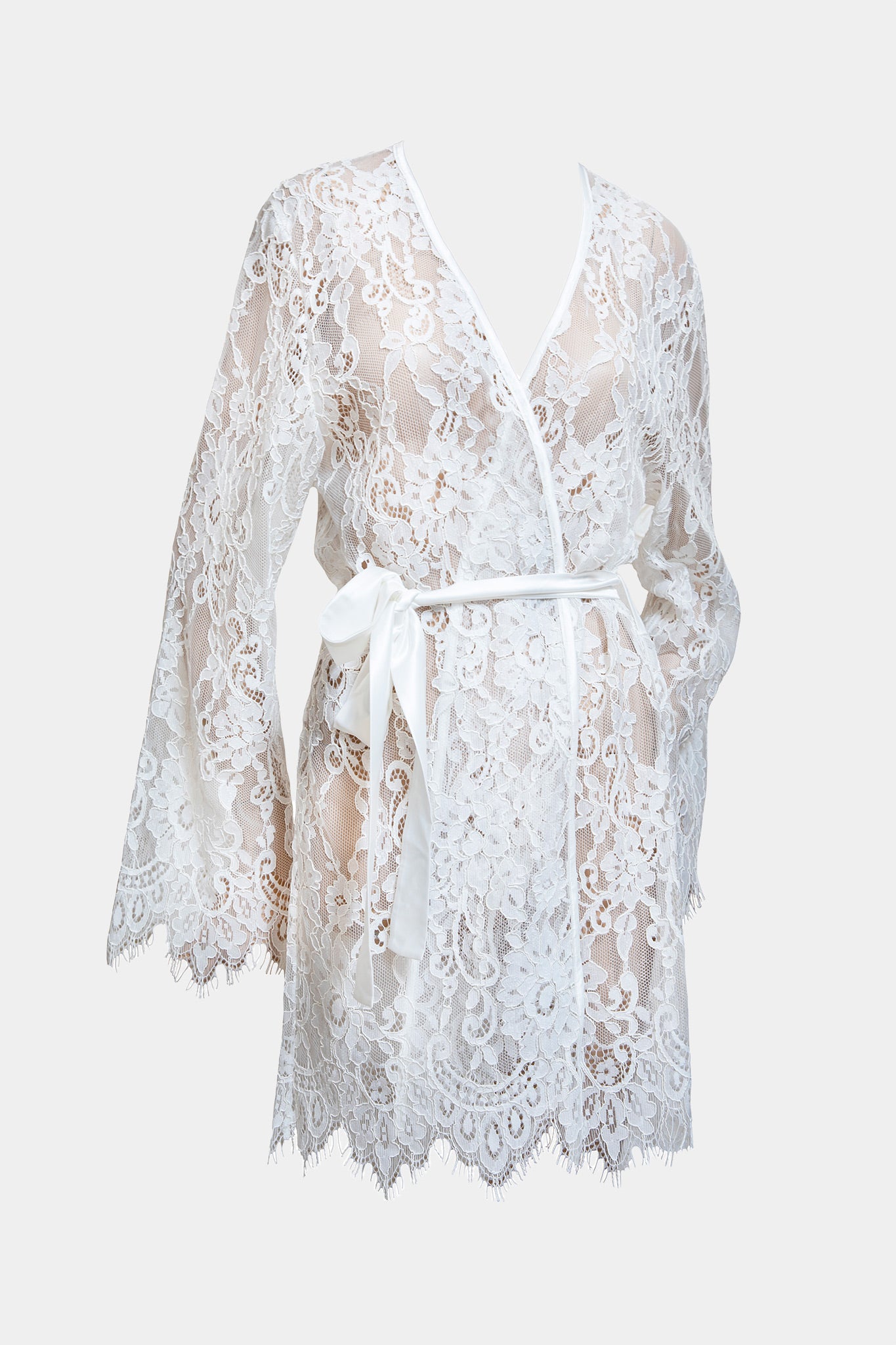 Gorgeous kimono made out of exclusive French lace with a satin belt. Ties from the side. Plunge V-neck. Loose long sleeves. Can be worn either as a nightwear or out as a kimono over a dress!