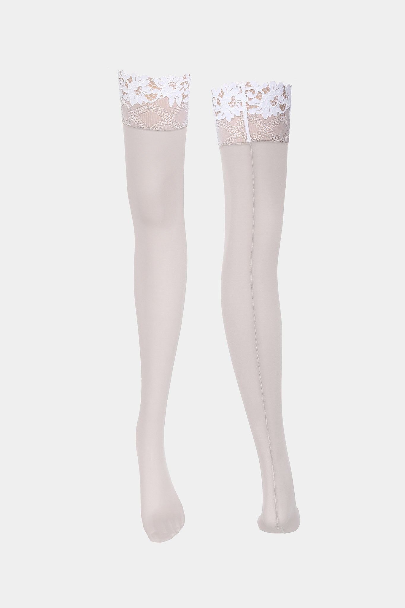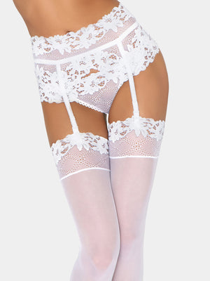 Daniella Bestseller stockings made out of very durable silky mesh and Italian stretched lace with floral motive. Vertical seam on the back. Lace on the top without silicone.
