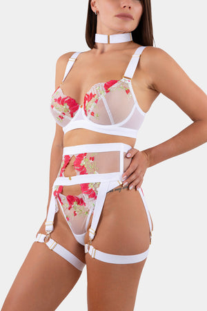 Lace thongs made from embroidered lace with a bright floral motif. Wide adjustable elastic straps add unique style and comfort. All accessories are gold-colored. The gusset is lined with 100% cotton.