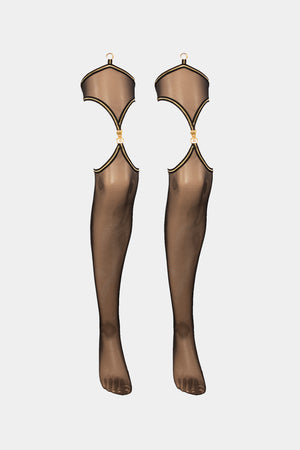 Unikālas zeķes, kas sastāv no divām daļām - kāju zeķes un zeķes, izgatavotas no īpaša, pret slīdēšanu izturīga tīkliņa. Dekorētas ar elastīgu lenti ar zeltainu mirdzumu. Metāla apaļas cilpas ērtai un ātrai savienošanai ar zeķu turētājiem. Šuve aizmugurē. Var kombinēt arī ar 5832 (kā attēlā).