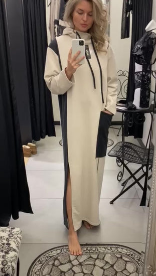Fashion HOODY Oversize long dress made out of soft and very warm high-quality cotton fabric. Inside of the hood is made of silky satin. On the right side is a large convenient pocket, the second side is accented with a different color, which allowsto make the silhouette slimmer.