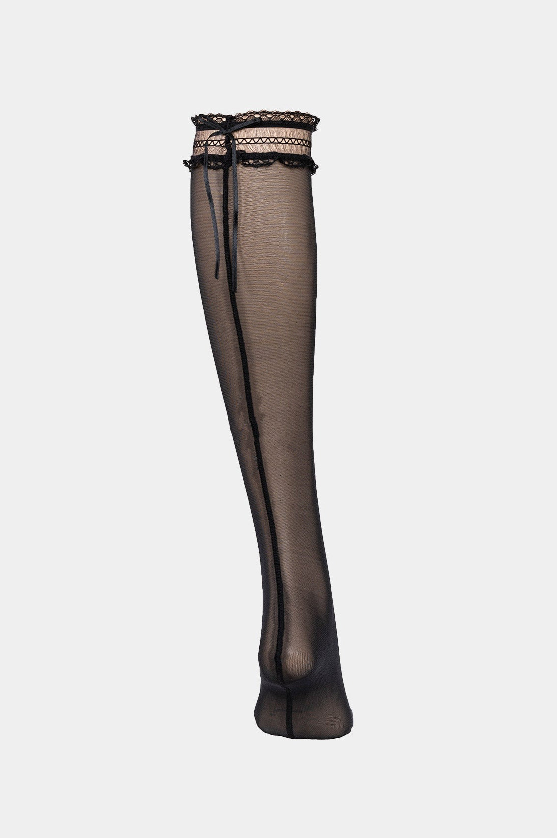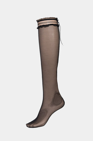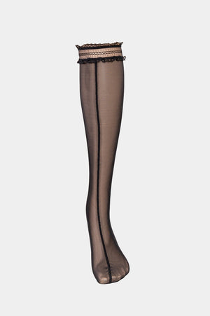 Long socks made out of elastic silk touch durable mesh. Decorated with elegant ruffle lace. Seam front and back for a better fit and comfort.