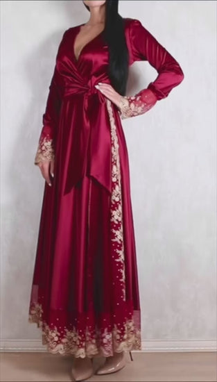 Designed with a long adjustable tie belt, this versatile piece can be worn both as elegant nightwear and as a stunning maxi dress for special occasions or evenings out. Perfect for women who appreciate premium fabrics, exquisite detailing, and timeless style.