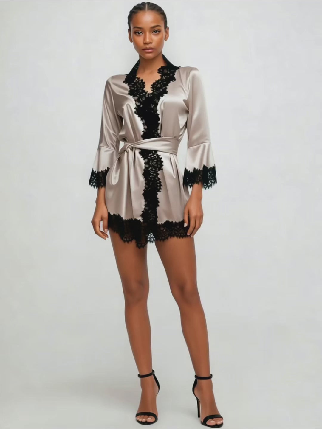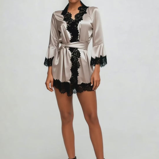 A premium satin kimono designed for those who choose luxurious comfort every day. The smooth, fluid fabric highlights the elegance of the silhouette, while the refined lace adds a touch of sophistication and femininity. The waist tie creates a flattering fit, making this piece a stylish choice that elevates every at-home moment.