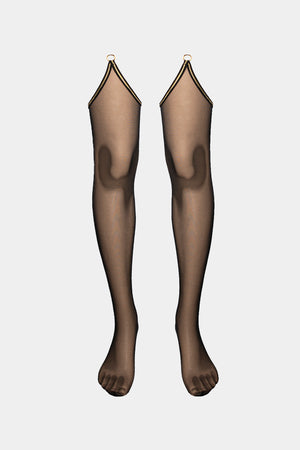 Unique stockings made out of special run-resistant net. Decorated with elastic tape with golden shimmer. Metal round loops for easy and fast connection to stocking holders. Seam on the back.