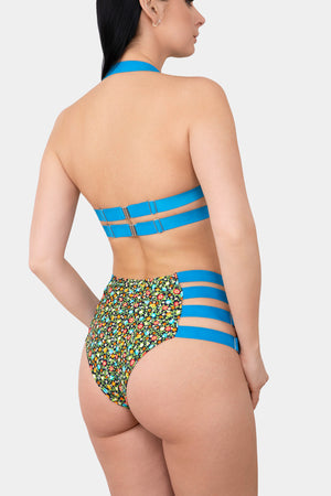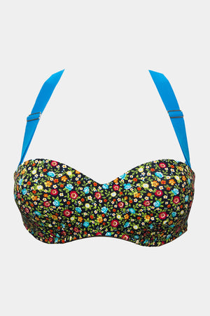 Underwired balconette bra top in floral motives. Molded cups provide additional effect of push-up, and visually enlarge the cleavage. Wide adjustable rubber-straps go behind the neck. Doubled buckles on the back.