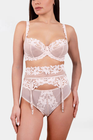Underwire soft cup bra made out from Italian stretched lace with floral motive and decorated of miniature satin roses on the center. The lace back on the big sizes lining of modular mesh for perfect fitting and great support . Adjustable shoulder straps from 1.5 cm wide for more comfort. Vertical seam on the cups for a rounder bust. Perfectly fits on small and plus sizes.