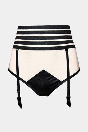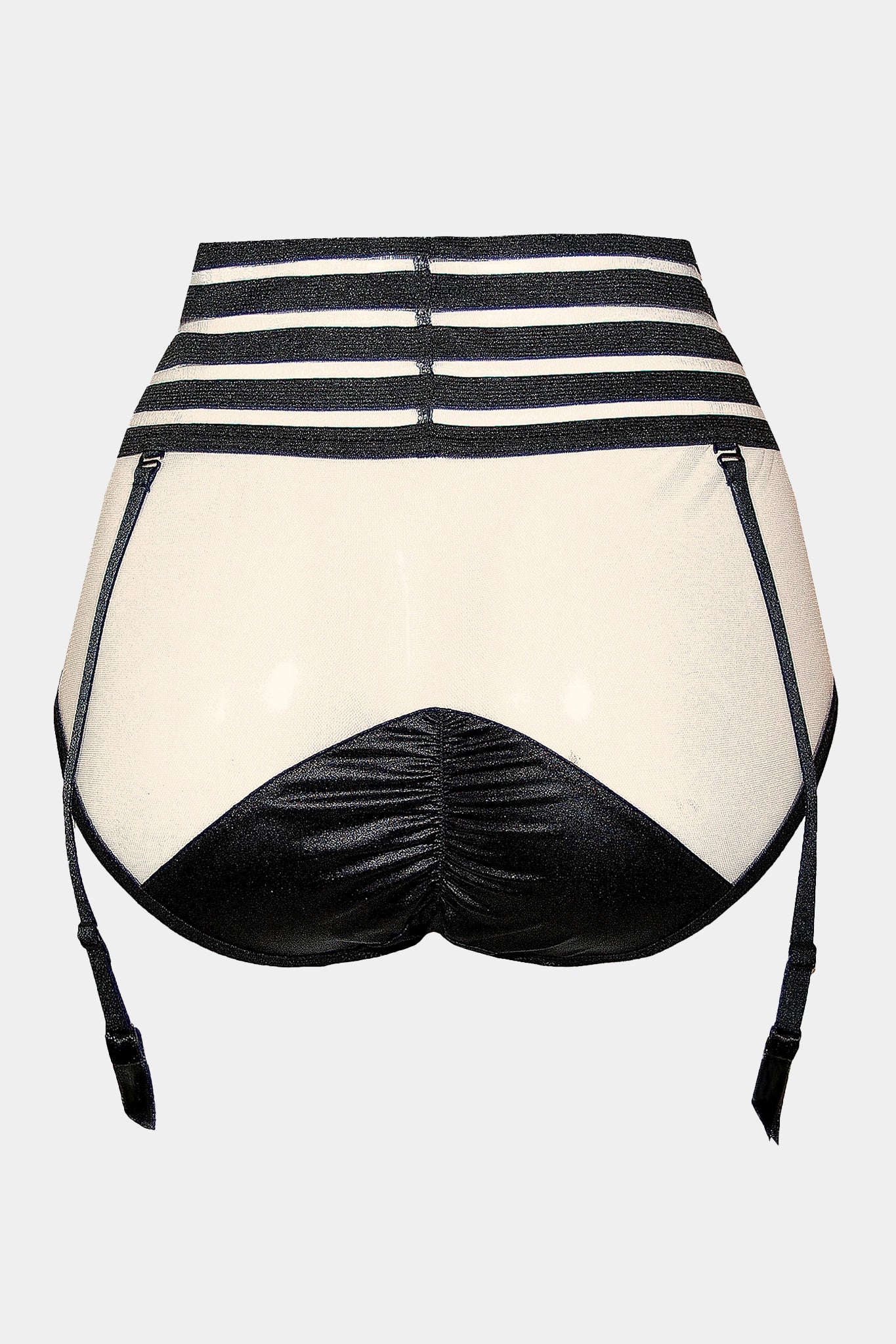 Трусики с высокой талией и модными геометрическими элементами из сетки и атласа. Эластичный сетчатый верх в полоску с лёгким утягивающим эффектом для идеальной посадки. Съёмные держатели для чулок. Хлопковая ластовица.