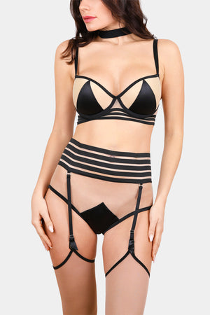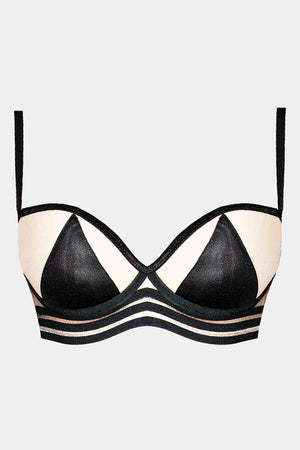 Бюстгальтер push-up на косточках с модными геометричными элементами, выполненный из эластичной полосатой тесьмы и гладких сатиновых деталей. Чашки push-up красиво приподнимают и поддерживают грудь, формируя округлую форму и выразительное декольте.